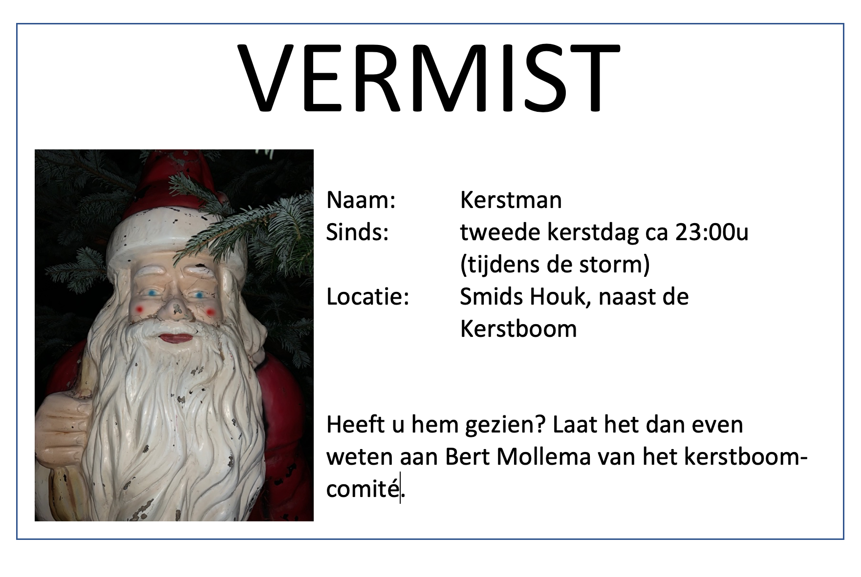 Door het stormachtige weer op Tweede Kerstdag (afgelopen zondag) is één van de Kerstmannen in het dorp de weg flink kwijt geraakt. Op de dorpswebsite is een beeld van de ongelukkige vader Kerst als vermist opgegeven.