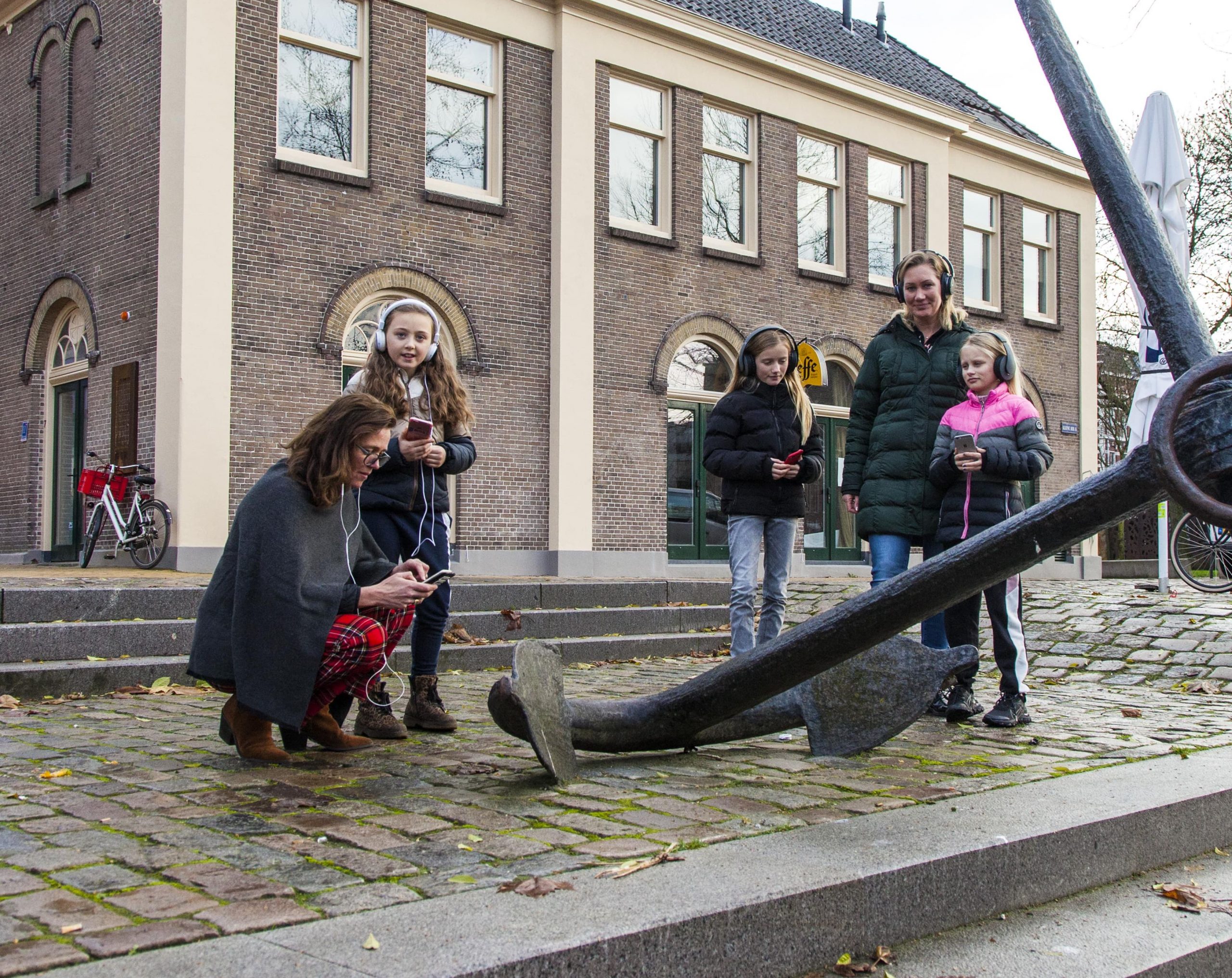 Sarah (8), Iris (8) en Tess (11) en hun moeders waren vrijdagmiddag de eerste gebruikers van de luisterroute, getiteld ‘Flarden uit het A-kwartier’. Ze liepen met een mobieltje in de hand en oortjes in hun oren over de uitgestorven Kleine en Hoge der A. De wandeling startte bij het anker op de Kleine der A, vlak naast museumcafé Het Pomphuis. In 50 minuten leidt de route de bezoekers over het Hoge der A, de Reitdiepskade, de Noorderhaven, de Hoekstraat, de Oude Kijk in ´t Jatstraat, de Grote Kromme Elleboog, de Akerkstraat, het Akerkhof weer terug naar de Brugstraat.