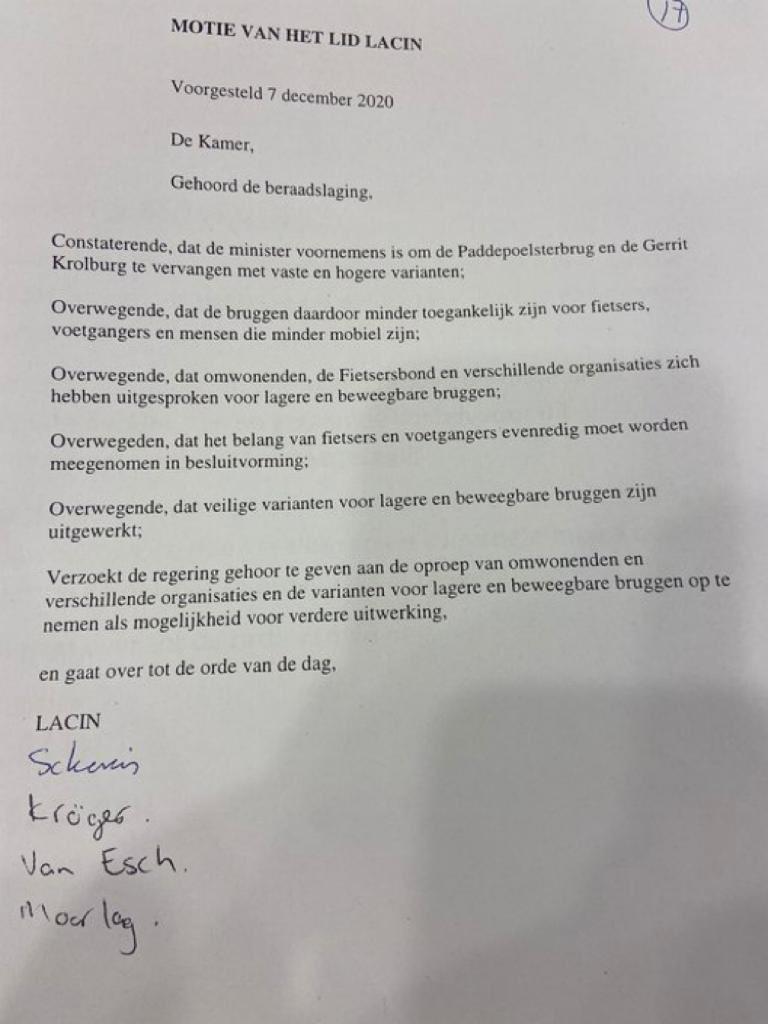 De vijf partijen nemen daar geen genoegen mee en dienden in de avond een motie in. De partijen stellen dat door hoge en vaste bruggen aan te leggen deze minder toegankelijk zijn voor fietsers, voetgangers en mindervaliden. Daarnaast hebben omwonenden en verschillende organisaties zich uitgesproken voor lage en beweegbare varianten. Ook vindt men dat het belang van fietsers en voetgangers evenredig moet worden meegenomen in de besluitvorming en dat veilige varianten voor lagere en beweegbare bruggen zijn uitgewerkt. Om die reden wordt verzocht gehoor te geven aan de oproep van de omwonenden en verschillende organisaties.
