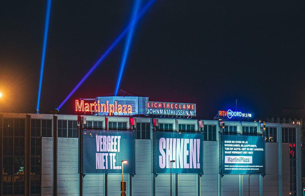 Om Groningers op het hart te drukken positief te blijven tijdens de lockdown, om te ‘shinen in je woonkamer, slaapkamer of tuin’, heeft MartiniPlaza drie grote lichtkanonnen op het dak van de evenementenlocatie gezet. Tot het nieuwe jaar is MartiniPlaza vanuit de wijde omtrek van de Stad te zien.