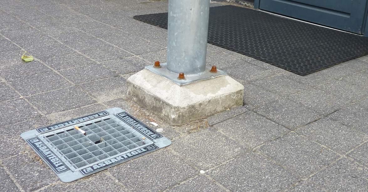 Asbaktegels bedoeld voor het opvangen van sigarettenpeuken mogen niet gebruikt worden op het Harm Buiterplein. Nu liggen er veel peuken op straat.