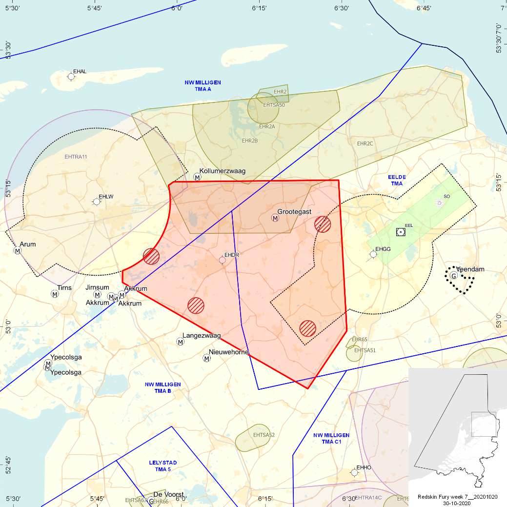 Helikopters van het Defensie Helikopter Commando werken samen met eenheden van de Koninklijke Landmacht tijdens de oefening Redskin Fury. Overdag mogen de helikopters op minimaal dertig meter hoogte boven het tijdelijke laagvlieggebied vliegen. Dit laagvlieggebied bevindt zich in het rode gebied op de onderstaande kaart. Na zonsondergang mogen de luchtvaartuigen op minimaal 90 meter hoogte over dit gebied vliegen.