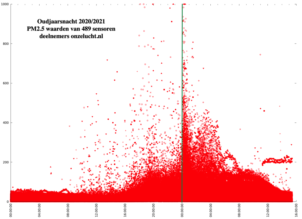 De hoeveelheid afgestoken vuurwerk veroorzaakt een duidelijke piek in de waardes in de hoeveelheid fijnstof. Precies om 0.00 uur slaan de meters uit. Vooral in Groningen en Drenthe pieken de fijnstof-metingen. De gemeten waarde is de PM2.5 waarde, dat zijn fijnstof-deeltjes kleiner dan 2,5 micrometer. Volgens wetenschappers vormen deze deeltjes het grootste gezondheidsrisico.