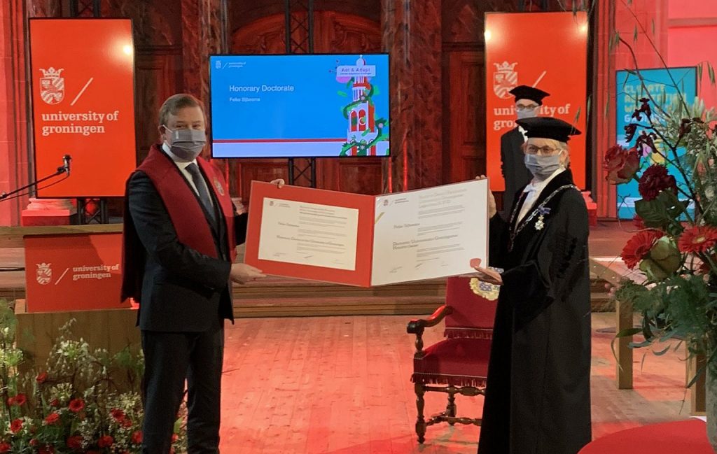 Feike Sijbesma heeft vrijdagmiddag van de Rijksuniversiteit Groningen (RUG) een eredoctoraat gekregen.