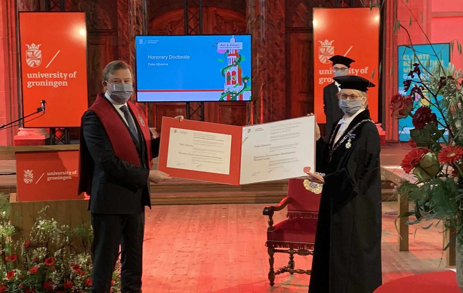 Het eredoctoraat werd uitgereikt door rector magnificus Cisca Wijmenga tijdens een Ceremonie als onderdeel van de Internationale Klimaatadaptatieweek.