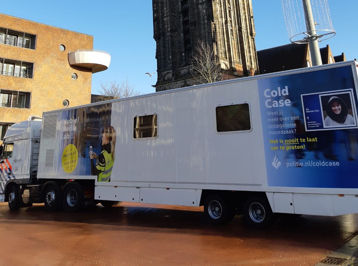 Het Mobiele Medialab van de politie stond vrijdagochtend op de Grote Markt om aandacht te vragen voor de moordzaak op Els Slurink.