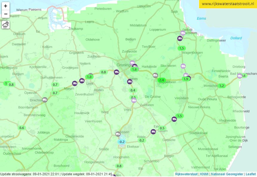 Op de website van Rijkswaterstaat is te zien dat vanaf 21.30 uur strooiwagens hun eerste strooironde aan het maken zijn: