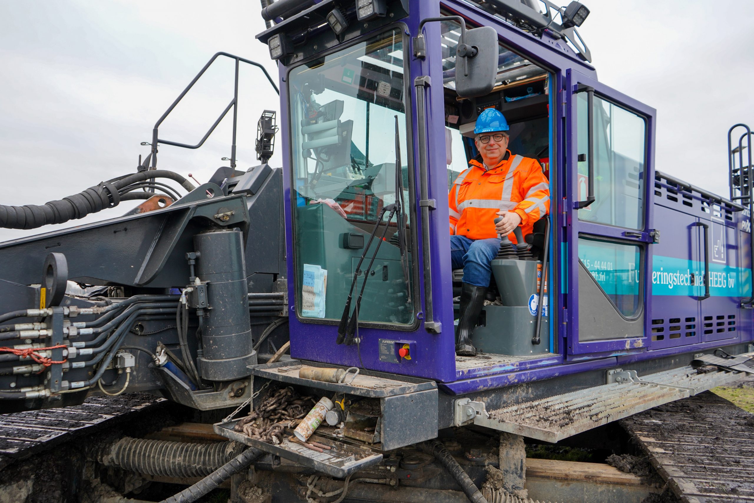 Wethouder Roeland van der Schaaf (PvdA) in de kraanmachine om de laatste paal te slaan. Foto: Bureau Meerstad