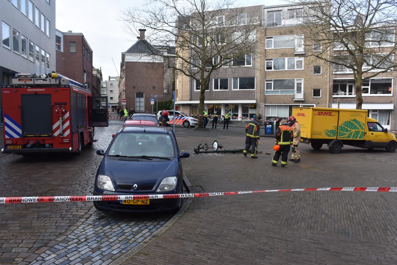 Een bestelwagen heeft donderdagochtend op de Sint Walburgstraat een oude lantaarnpaal omver gereden.