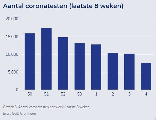 De GGD concludeert dat ondanks een afname van het aantal coronabesmettingen de aantallen hoog blijven “Dit sluit aan bij de landelijke trend. Voor de provincie als geheel zitten we deze week op circa 133 meldingen per 100.000 inwoners.” De meeste besmettingsmeldingen afgelopen week kwamen uit de gemeente Pekela met 328 op 100.000. Westerwolde scoort 284, Oldambt 230, Veendam 175 en Westerkwartier 131. In de afgelopen week kwamen er 11 personen in de provincie te overlijden ten gevolge van een bewezen corona-infectie. Het totale aantal overlijdens komt daarmee op 152 te liggen.