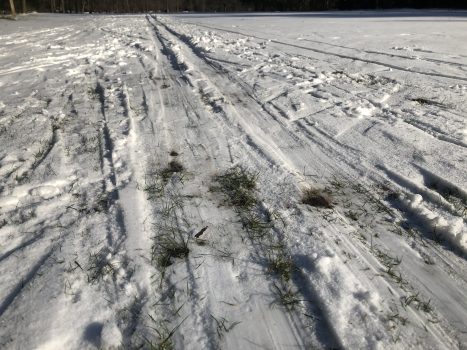 Op sommige plaatsen is de sneeuw verdwenen en schuren de langlauflatjes kleine stukjes gras kapot. Harm de Vries, baanonderhouder, is er koeltjes onder: ‘Dat valt allemaal wel mee. Dat is het voordeel van gras he, het groeit wel weer aan.’ Bovendien gaat de loipe niet over de greens, de kortste en kwetsbaarste stukken gras.