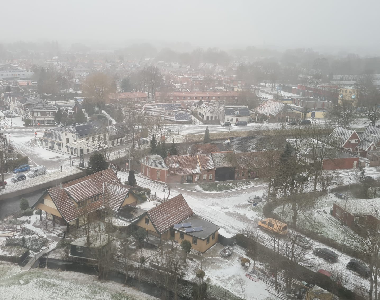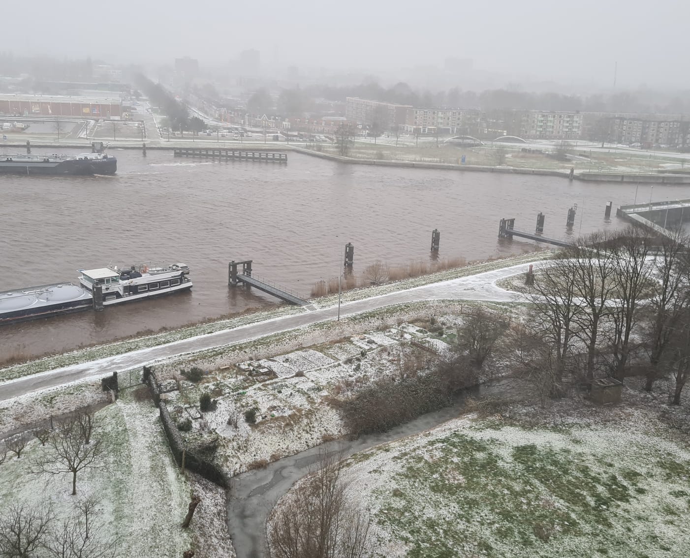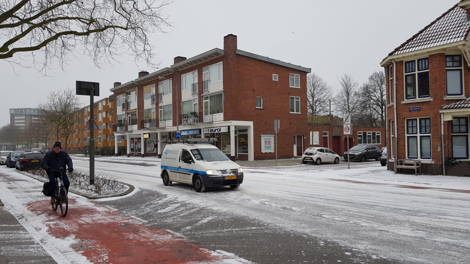 Een neerslaggebied bereikte in de nanacht Groningen. Rond 04.30 uur begon het te sneeuwen. Waar het in andere delen van het land vele centimeters opleverde blijft het in Groningen tot nu toe bij een klein laagje. “Het lijkt wel heel mooi”, vertelt fotograaf Mike Weening. “Ik merk wel dat het glad is. Ook wegen en fietspaden zijn wit en op sommige plekken is het best wel glad.”