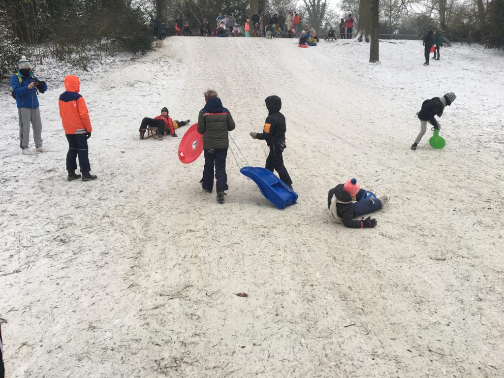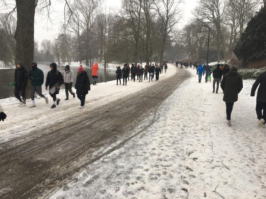 Ondanks dat er een ‘code rood’ geldt weerhoudt het mensen niet om de straat op te gaan. In het Noorderplantsoen was het zondagmiddag druk. “Men maakt veel plezier”, ziet verslaggever Ecco van Oosterhout. “Kinderen gaan op sleetjes van de heuvels naar beneden en ook is er veel belangstelling voor de koffie-verkoop bij Zondag. Er stond daar een flinke rij.”