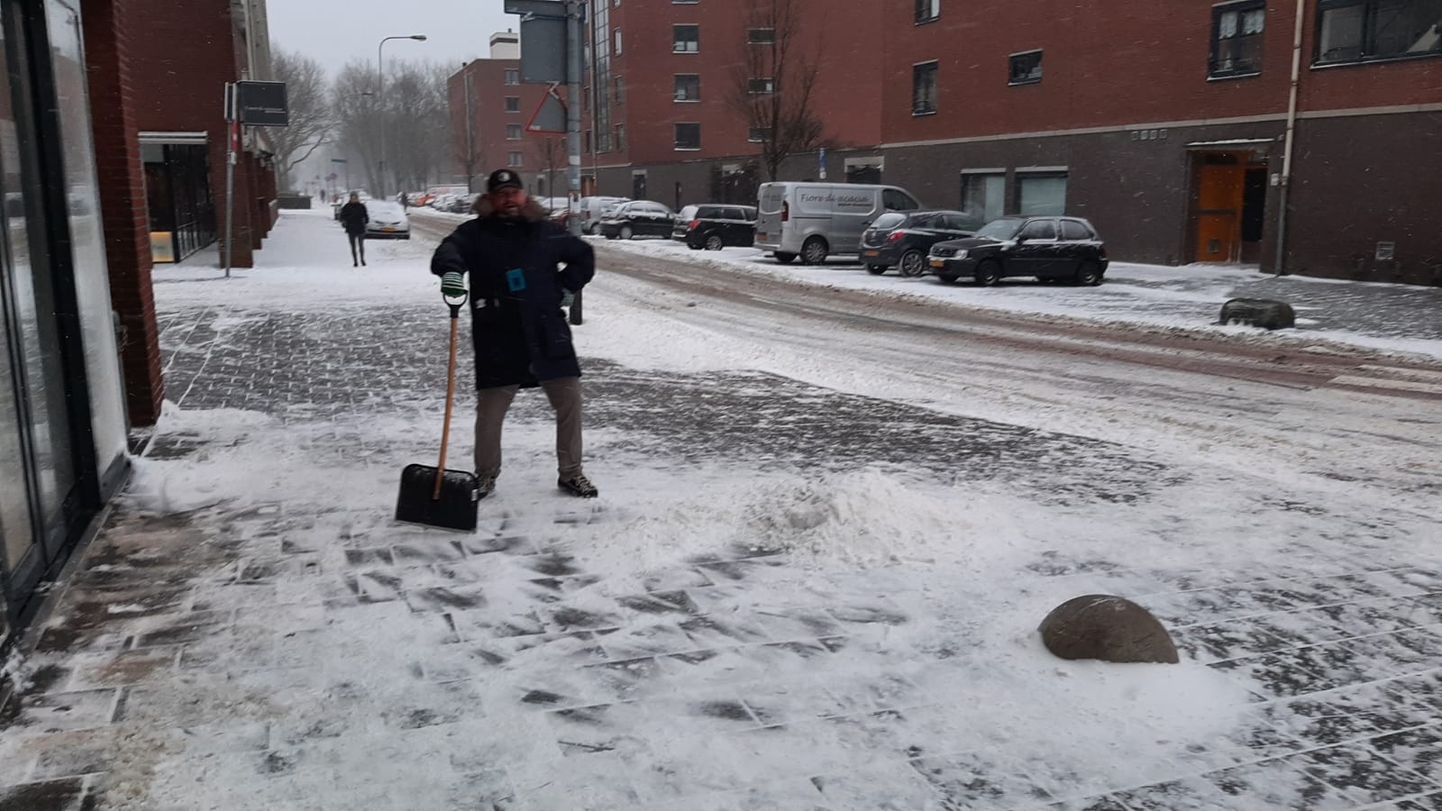 Verkoper Willem van straatkrant De Riepe stak zondag zijn handen uit de mouwen (zie hoofdfoto). “Door de sneeuw en ijzige omstandigheden verkoopt hij niets”, zegt verslaggever Andor Heij. “Daarom heeft hij maar besloten om de straat voor de supermarkt in de Indische Buurt schoon te vegen.