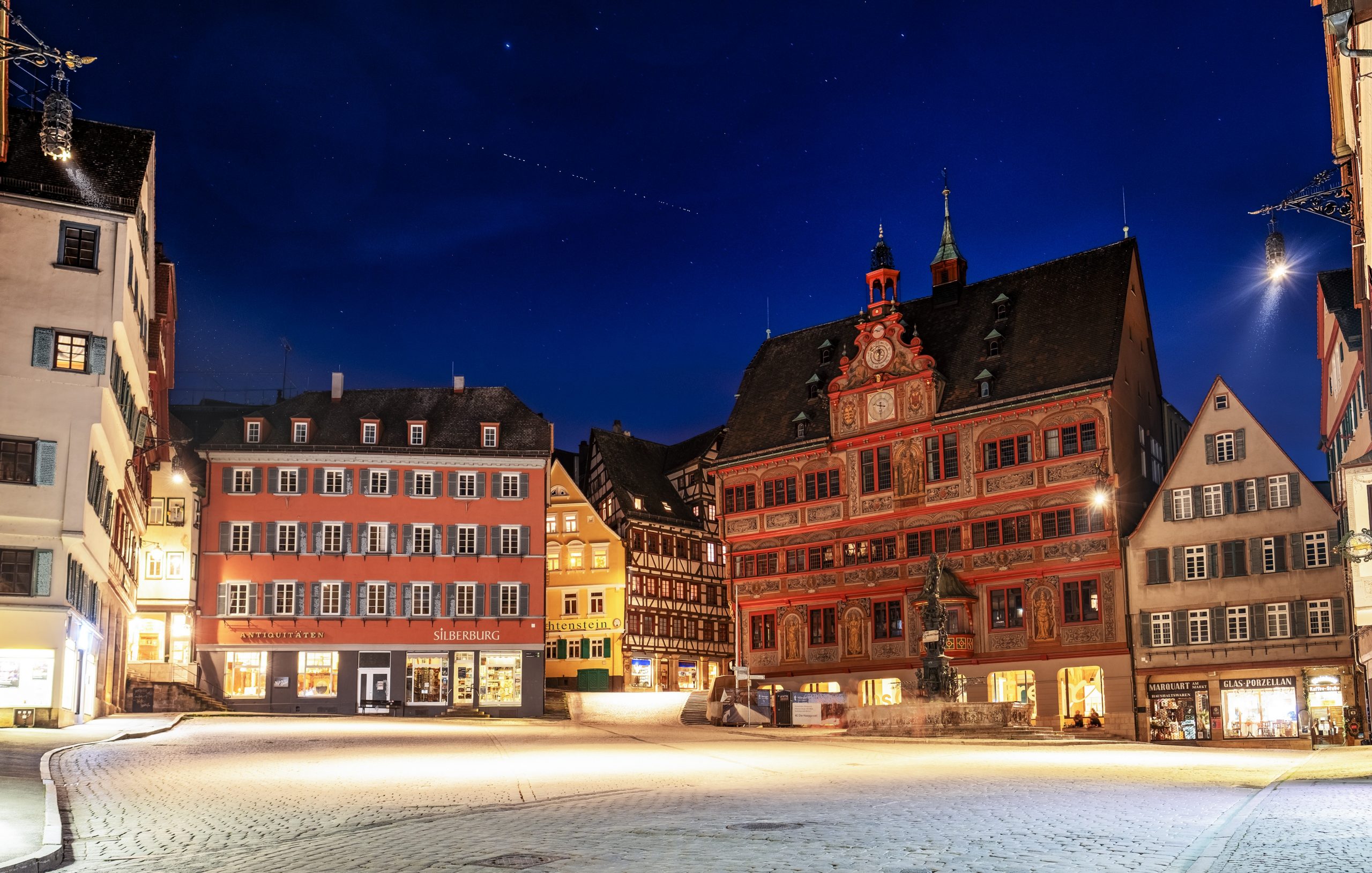 Een Starlink-treintje boven het stadhuis in Tübingen in april 2020. Foto: Dktue - Eigen werk, CC0, https://commons.wikimedia.org/w/index.php?curid=89455279