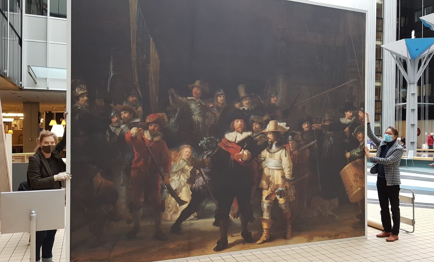 Levensgrote reproducties van het meesterwerk van Rembrandt van Rijn reizen, sinds de uitbraak van het coronavirus, langs verschillende zorginstellingen in Nederland. Deze week staat één van de grote replica’s van de Nachtwacht in het Universitair Medisch Centrum Groningen.