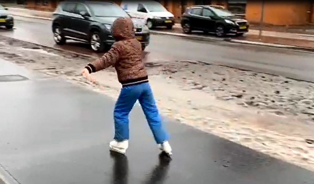 “Ik zag de beijzelde straat en ik moest direct denken aan een verhaal dat mijn moeder indertijd eens verteld heeft. Ze is ooit na een ijzelregenbui eens op schaatsen naar school gegaan. Met dat verhaal in mijn achterhoofd dacht ik dat het leuk was om mijn dochter dat ook te laten doen, schaatsen over de straat. Het filmpje daarvan stuurde ik naar opa en oma. Voor de grap plaatste ik het ook op social media.”