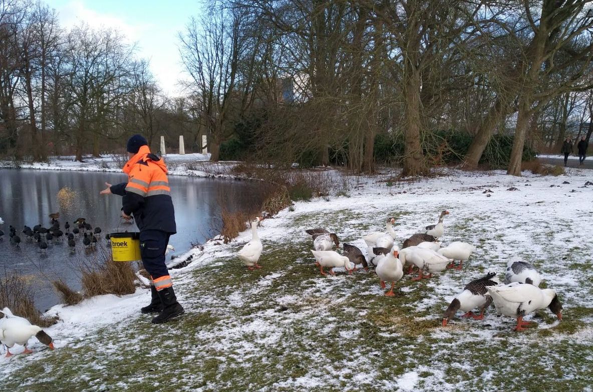 De vogels worden twee tot drie keer per week gevoerd door medewerkers van Stadsbeheer. Als het koud is, hebben vogels meer voedsel nodig om hun lichaamstemperatuur op peil te houden.