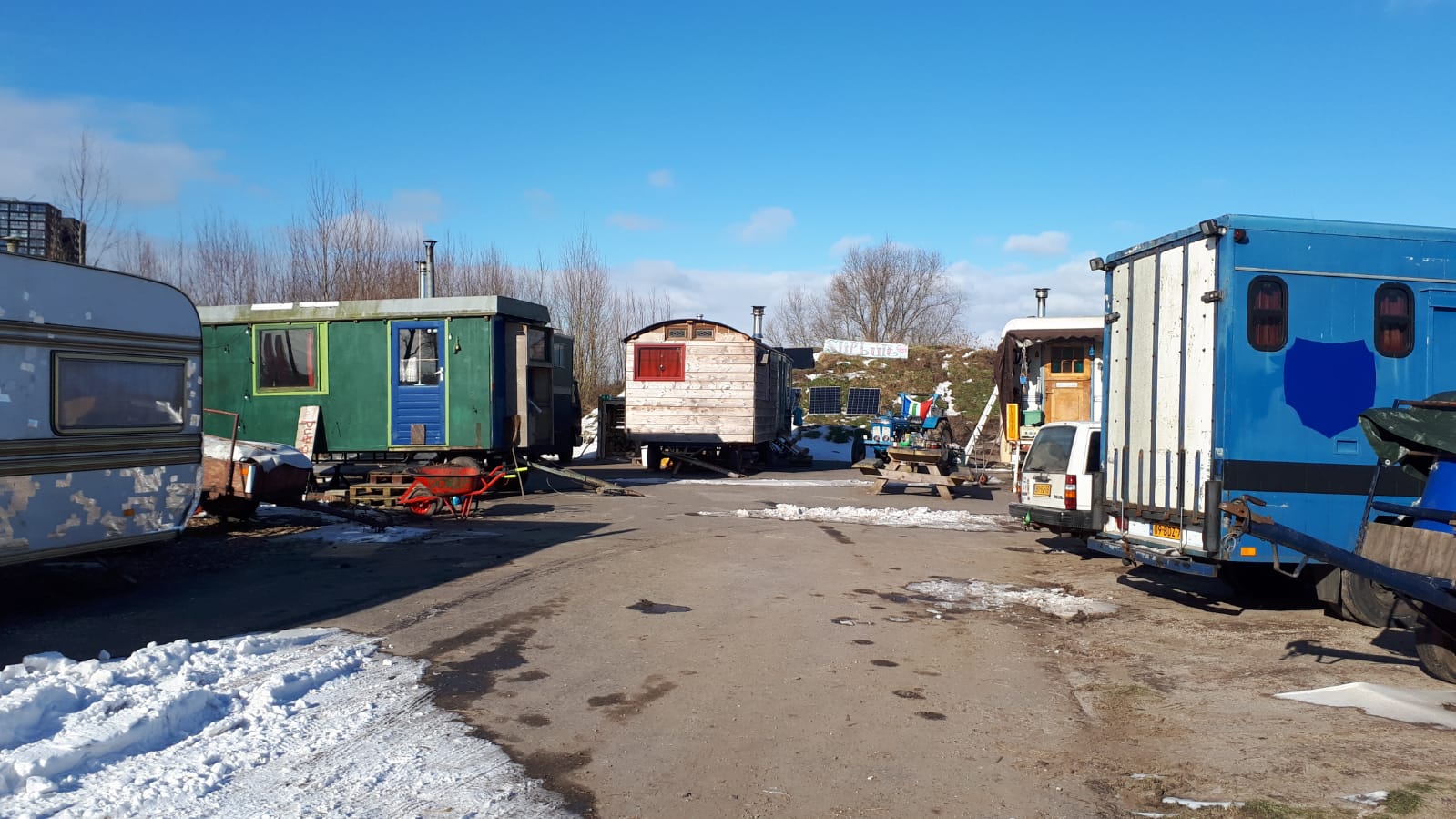 De stadsnomaden moesten weg van hun plek en zouden aan de Gideonweg worden geplaatst, een stuk verderop waar ook andere stadsnomaden werden geplaatst. Die waren daar niet blij mee en kregen ook al een andere plek toegewezen. De hernieuwde communicatie met de gemeente doet de stadsnomaden goed: “We zijn vooral erg blij met de richting die we op zijn geslagen in de omgang met de gemeente,” vertelt Eva.