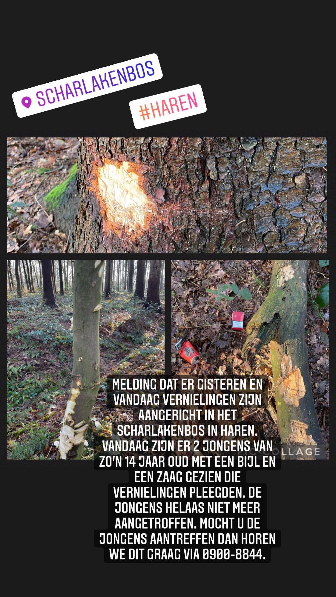 In het Scharlakenbos in Haren zijn donderdag en vrijdag bomen vernield. De politie vermoedt dat twee jongens van ongeveer veertien jaar de vernielingen hebben aangericht.