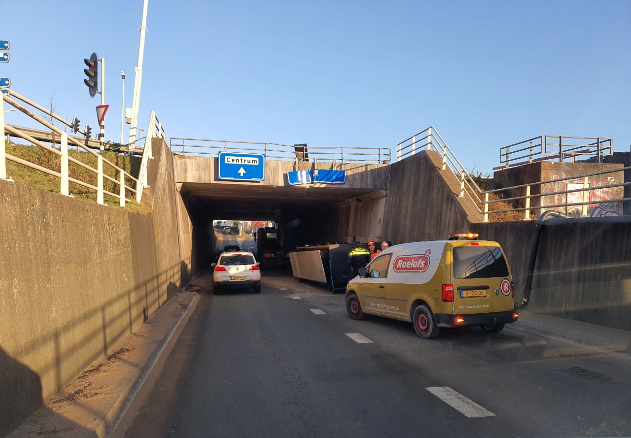 Een vrachtwagen heeft vrijdagochtend een viaduct onder het Julianaplein geramd en is daarbij zijn laadbak verloren.