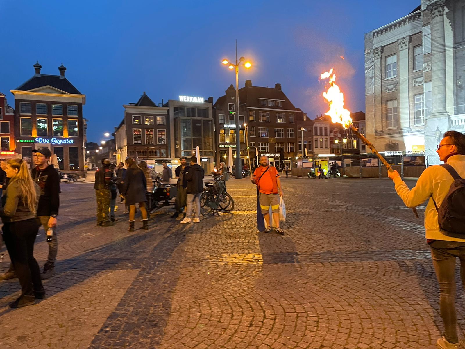 Een groep mensen protesteert woensdagavond op de Grote Markt tegen de coronamaatregelen. De personen dragen bij de actie fakkels.