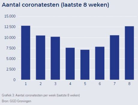 Het aantal besmettingen in de provincie is de afgelopen week toegenomen. De meeste nieuwe besmettingen werden gevonden in de gemeente Oldambt. Daar ging het om 330 nieuwe gevallen per 100.000 inwoners. Volgens de GGD is een werk gerelateerd cluster hiervoor verantwoordelijk. In de gemeente Pekela gaat het om 279 per 100.000, Eemsdelta 218, Midden-Groningen 217 en Groningen om 176. In de gemeente Groningen gaat het om een flinke toename omdat het getal vorige week nog op 132 stond. In de afgelopen week kwamen er vijftien personen te overlijden aan de gevolgen van het coronavirus. Het totaal aantal sterfgevallen in onze provincie stijgt hiermee naar 199.