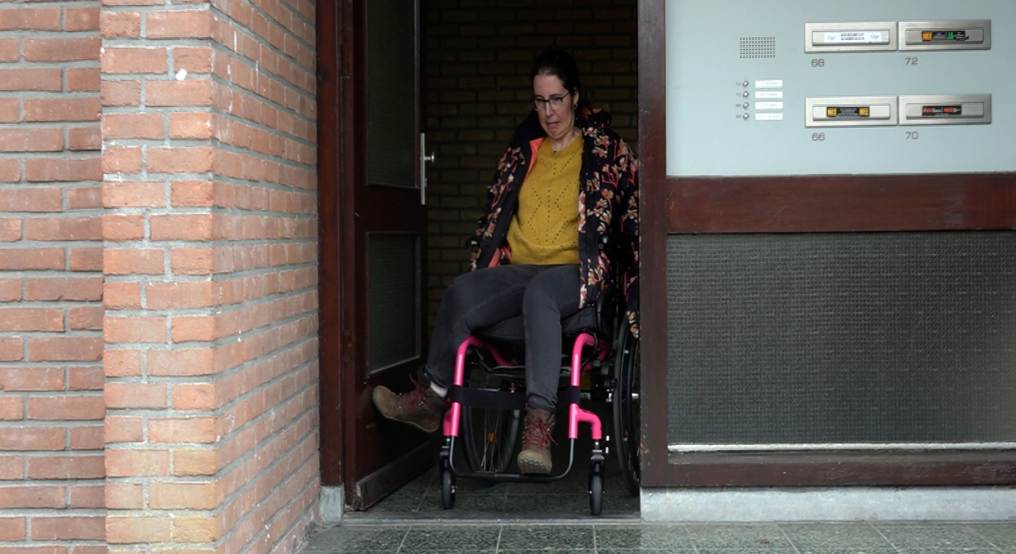 En dus kan Ellie niet in haar portiekwoning in Haren blijven wonen. Daarin zitten onder meer een zware voordeur, drempels en nauwe doorgangen. Een lift ontbreekt. Niet geschikt voor een rolstoel dus.