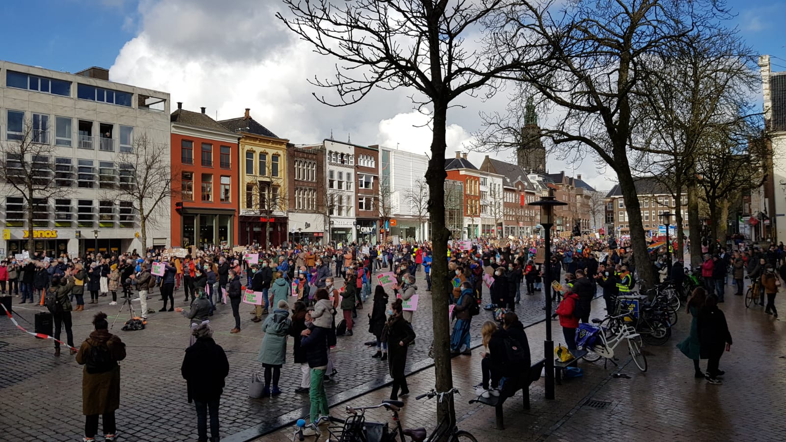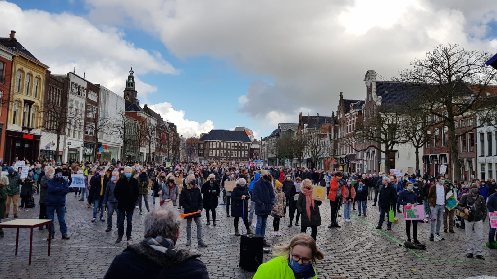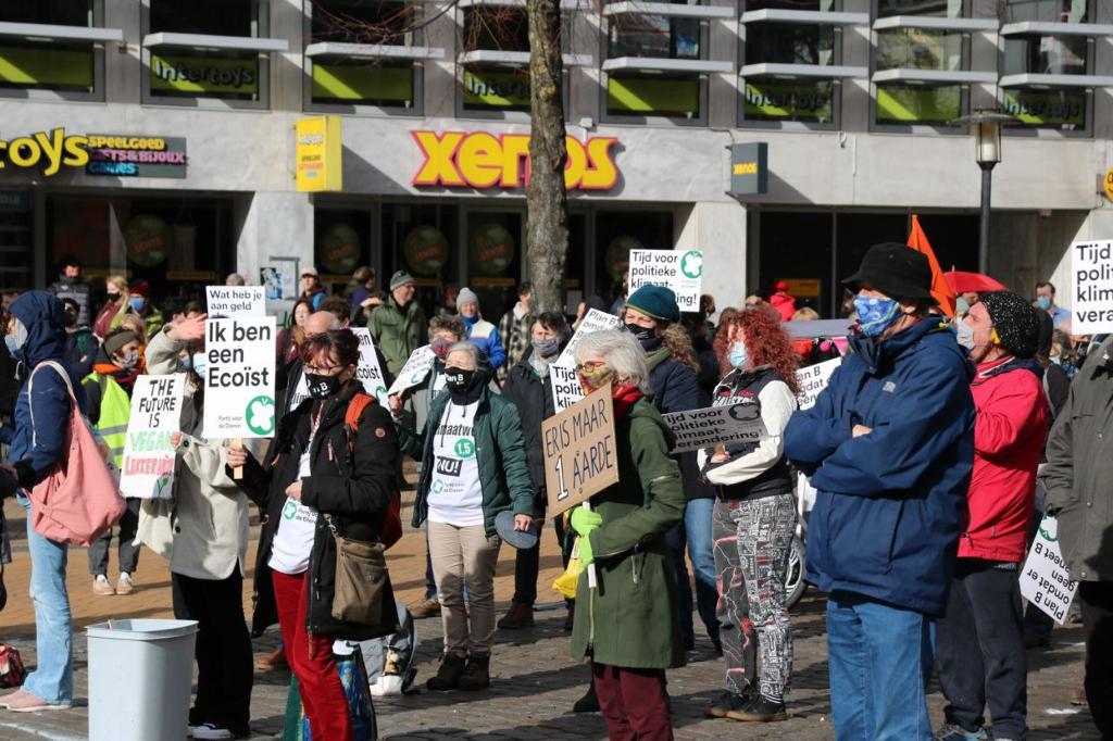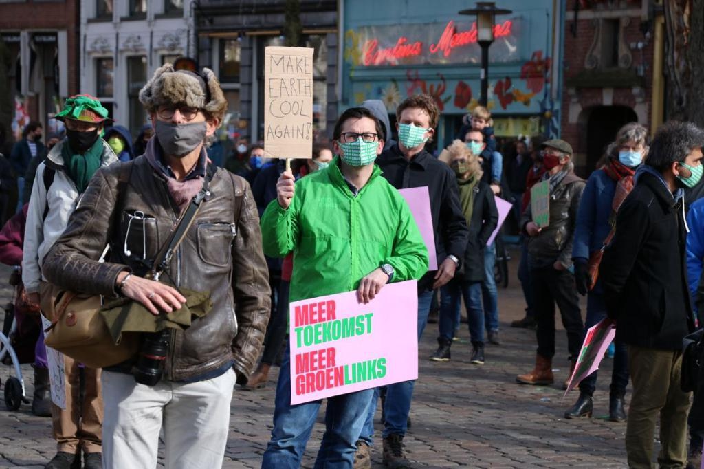 De actie op de Vismarkt begon om 14.00 uur. Doel is om aandacht te vragen voor een eerlijk en daadkrachtig klimaatbeleid. De actie wordt georganiseerd door onder andere Oxfam Novib, Greenpeace en Extinction Rebellion. In Groningen heeft de Groninger Klimaatcoalitie een belangrijke rol. Zij vinden dat de overheid bedrijven meer moet laten betalen voor klimaatschade en willen dat het geld aan coronasteun wordt ingezet om Nederland eerlijker en groener te maken. “De sfeer is uitstekend”, laat één van de aanwezigen weten. “De Vismarkt staat van voor tot achter helemaal vol, waarbij iedereen rekening houdt met de geldende coronamaatregelen. Opvallend is ook dat de deelnemers uit alle hoeken van de samenleving komen, van jong tot oud.”