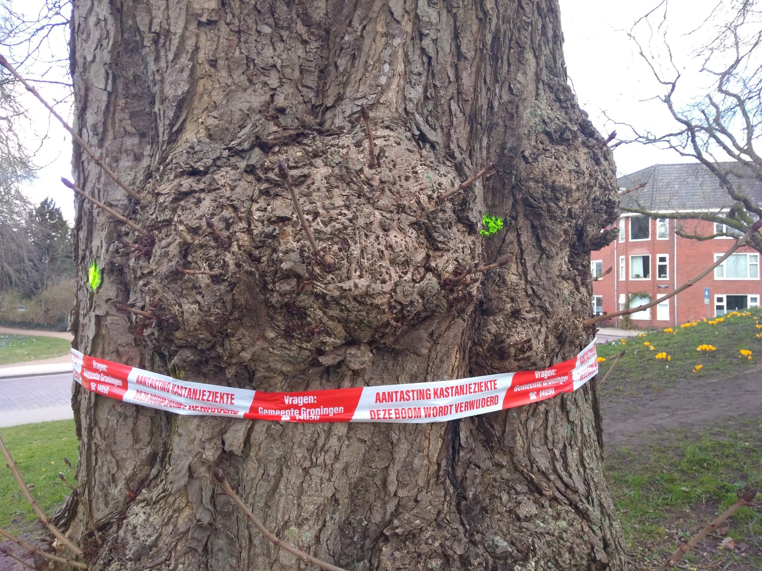 De Parkcommissie Noorderplantsoen bevestigt de kap deze zaterdagmiddag (zie Facebookpost onder). Nabij het paviljoen staat ook een kastanje met hetzelfde lint. ‘Nee laat staan’, heeft iemand er bijgeschreven. Nog twee andere kastanjes in het park zijn binnenkort hetzelfde lot beschoren.