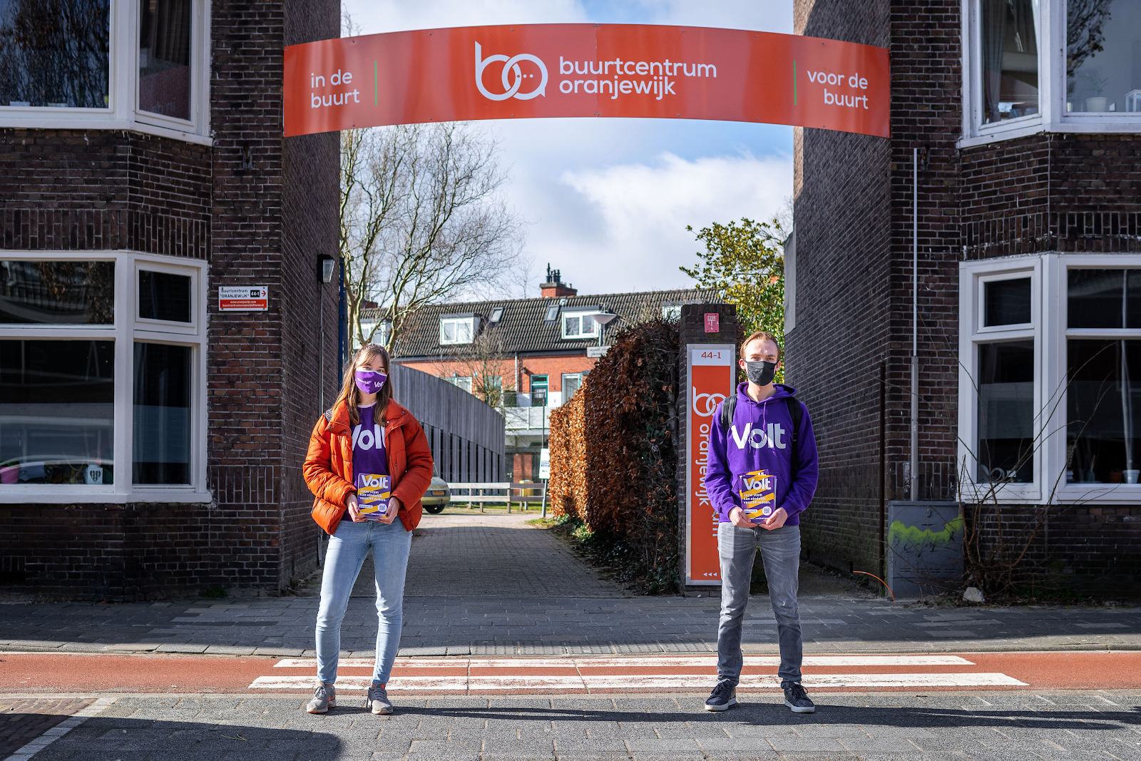 Leden van Volt aan het flyeren in de Oranjebuurt. Foto: Volt Groningen