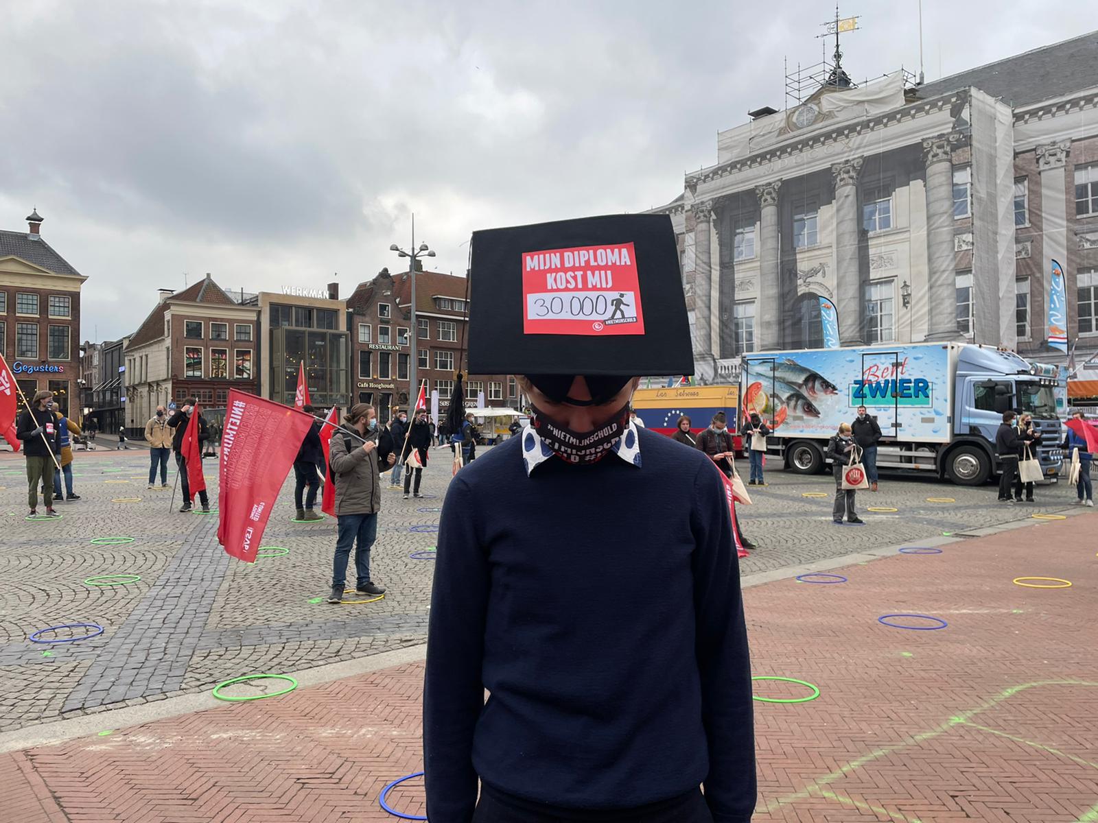 Studenten uit het hoger onderwijs demonstreerden dinsdagmiddag op de Grote Markt tegen het leenstelsel. De demonstratie is georganiseerd door de Groninger Studentenbond, FNV Young & United en de Landelijke Studentenvakbond, LSVb.