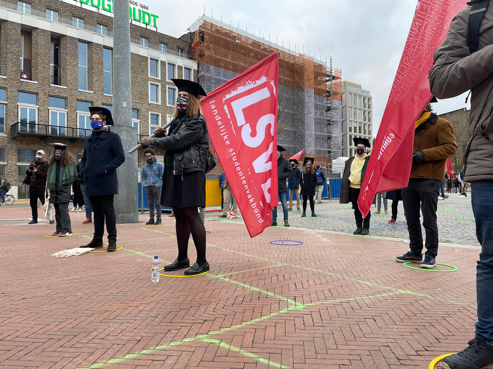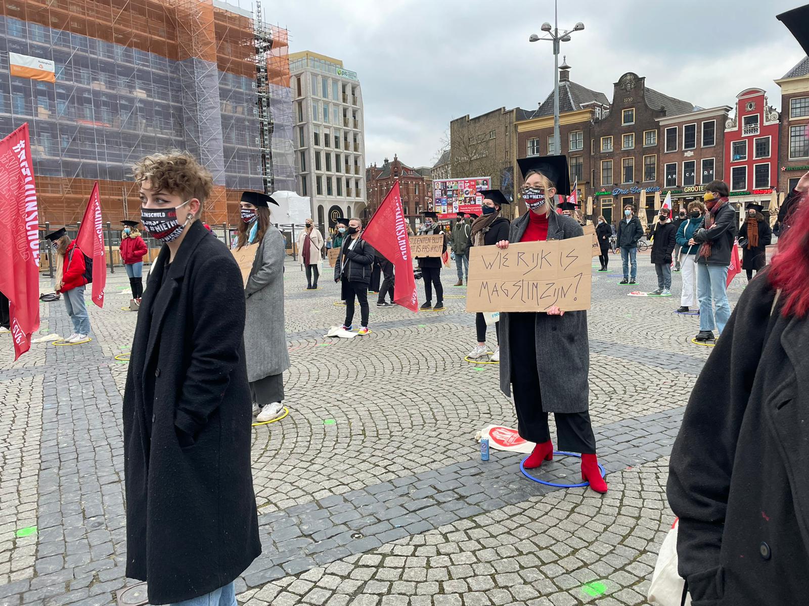 De demonstratie begon om 17.00 uur. “Er hebben zich 160 studenten voor de actie aangemeld”, vertelt verslaggeefster Anneloes Struik. “De aanwezige studenten dragen een sticker met daarop geschreven de hoogte van hun studieschuld.” De studenten vinden dat er iets moet veranderen. Het leenstelstel was een experiment dat volgens hen mislukt is, waar ze nu de dupe van zijn.