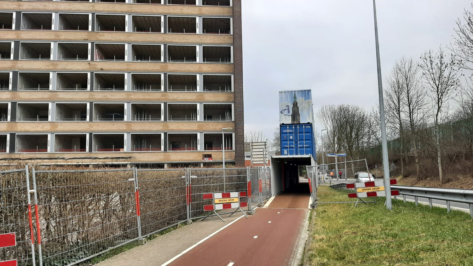 De tunnel is een veiligheidsmaatregel voor het geval er puin van de flat naar beneden komt. Dat komt door de tunnel dan niet op het fietspad terecht.