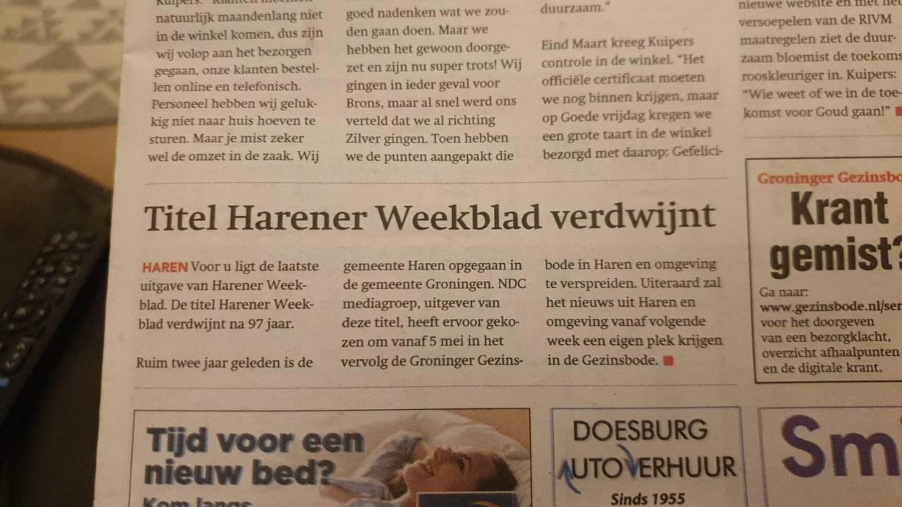 De laatste uitgave lag afgelopen woensdag voor het laatst op de deurmat in Haren. Het Harener Weekblad heeft 97 jaar bestaan. In Haren wordt vanaf volgende week woensdag de Groninger Gezinsbode bezorgd.