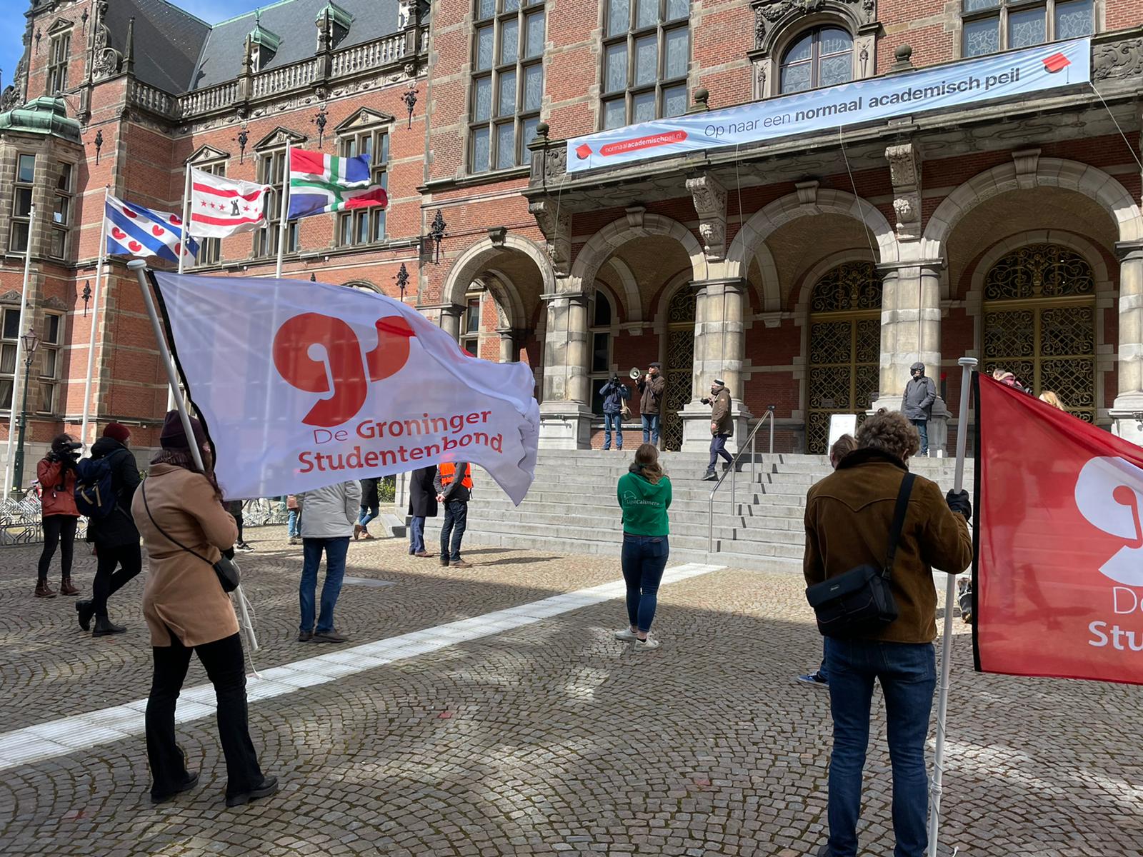 Wetenschappers, studenten en personeel van de Rijksuniversiteit Groningen hebben op 6 april de noodklok geluid. Het protest op het Academieplein maakt deel uit van een landelijke actiedag van Normaal Academisch Peil. De landelijke coalitie vraagt het nieuwe kabinet om structureel 1,1 miljard euro extra te investeren in het wetenschappelijk onderwijs.