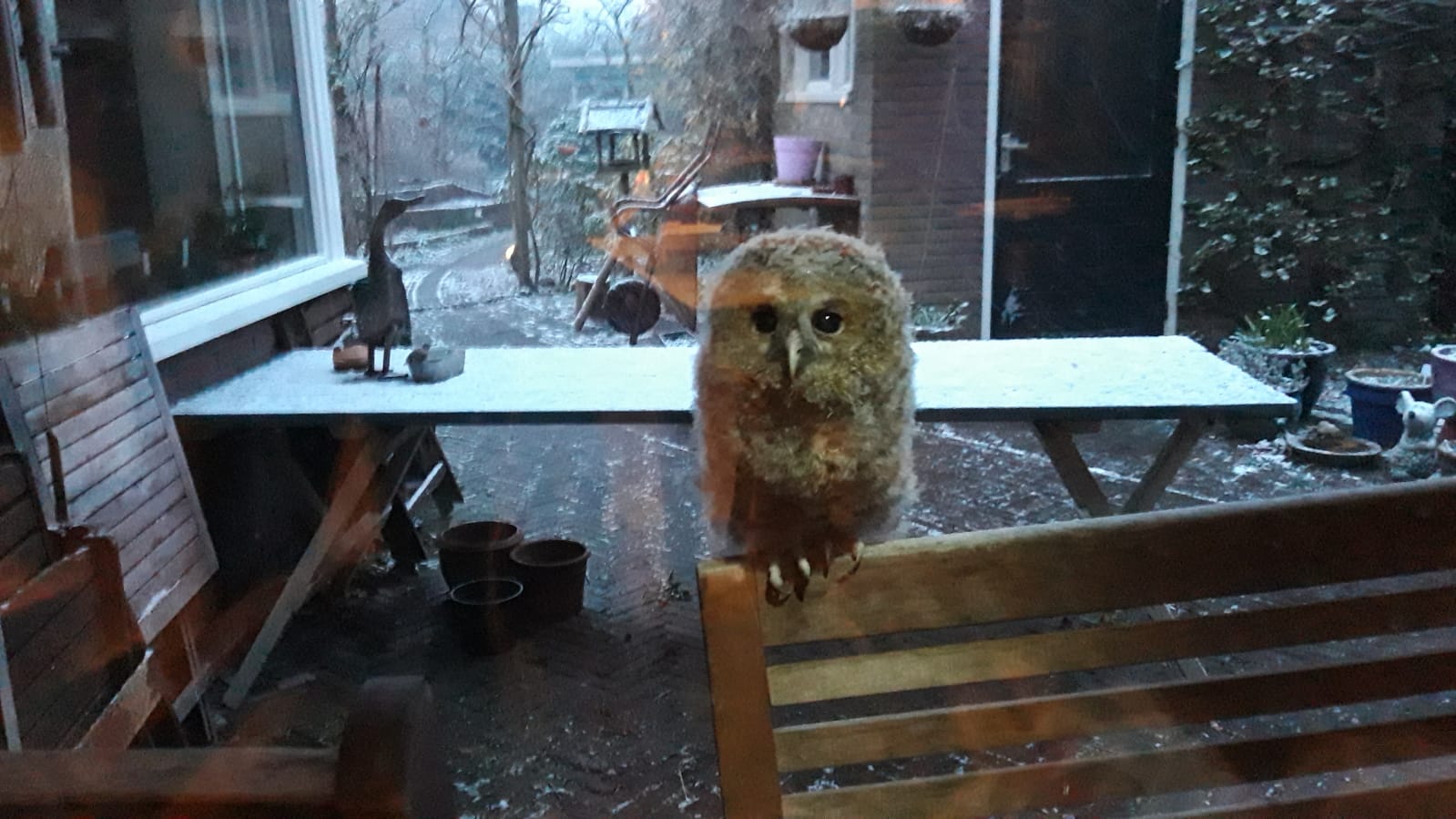 In een achtertuin aan de Oosterweg in Haren is een jonge bosuil geland op het tuinmeubilair. Hij kijkt verbaasd naar de fotograaf.