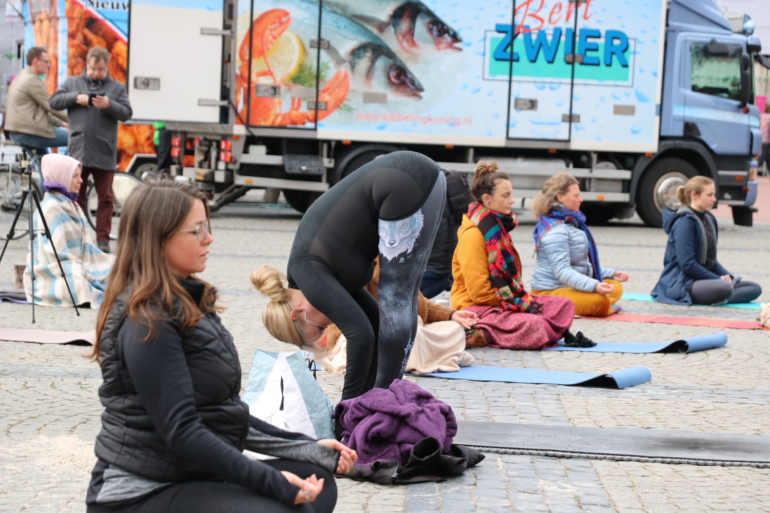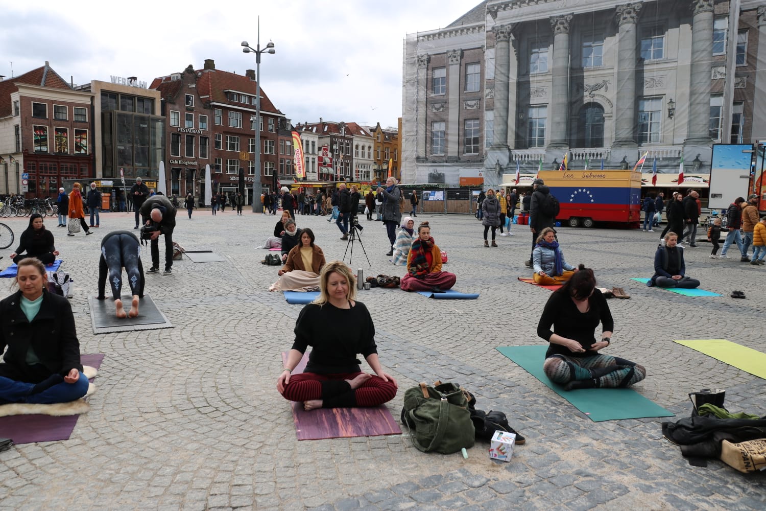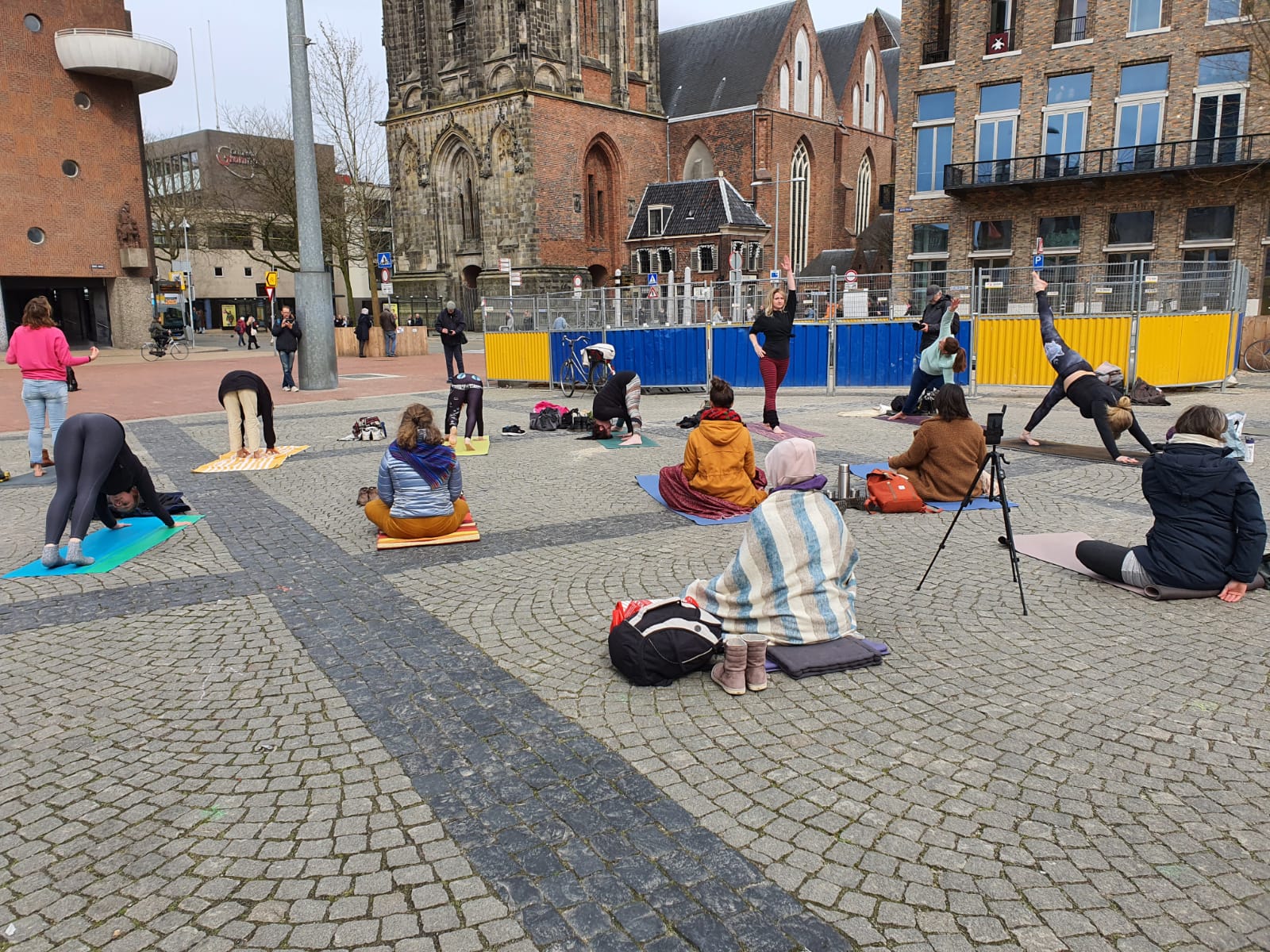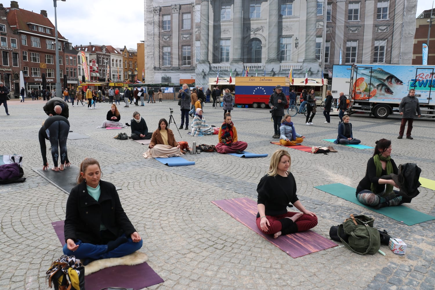 Rond 14.00 uur installeerden de docenten zich op de Grote Markt waarbij men hun yogamat uitrolde. “Het is één van de meest rustige demonstraties die ik ooit heb gezien”, laat een fotograaf weten. “Al mediterend vraagt men aandacht voor de situatie.” Organisator Marga Groenewold laat weten dat de situatie in de sector zorgwekkend is. Het water zou veel studio’s en docenten tot aan de lippen staan en her en der zouden al studio’s zijn omgevallen. Daar komt bij dat men veelal niet in aanmerking komt voor steunmaatregelen die vanuit de overheid zijn opgezet.