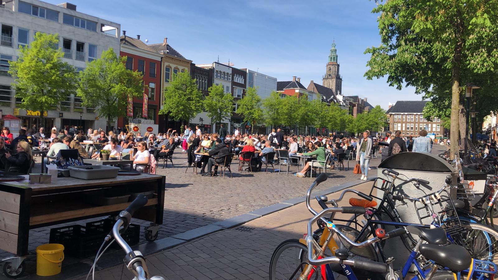 Veel mensen zijn op hun vrije dag afgekomen op de terrassen. Op de Vismarkt is het uitgebreide terras voor omliggende ondernemers een uitkomst, zowel voor de uitbaters als voor de gemeente. De anderhalvemeterregel lijkt goed hanteerbaar.