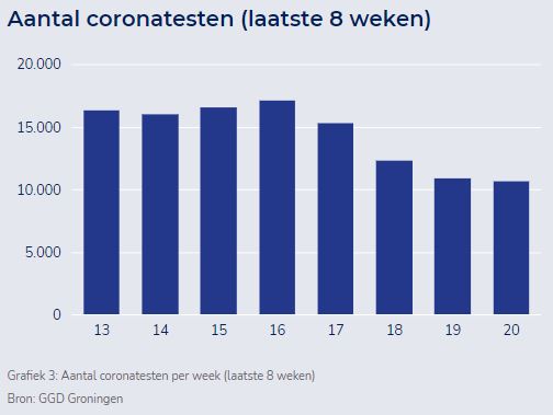 In de afgelopen week werden er 10.712 personen getest op het coronavirus. Van hen kregen er 610 een positief testresultaat. Dit is ongeveer 5,7 procent. Het aantal afgenomen testen is in de afgelopen week gelijk gebleven. Landelijk wordt er een daling gezien in het aantal afgenomen testen. Ten opzichte van landelijk is in de provincie Groningen de hoogste testbereidheid in combinatie met het laagste vindpercentage.