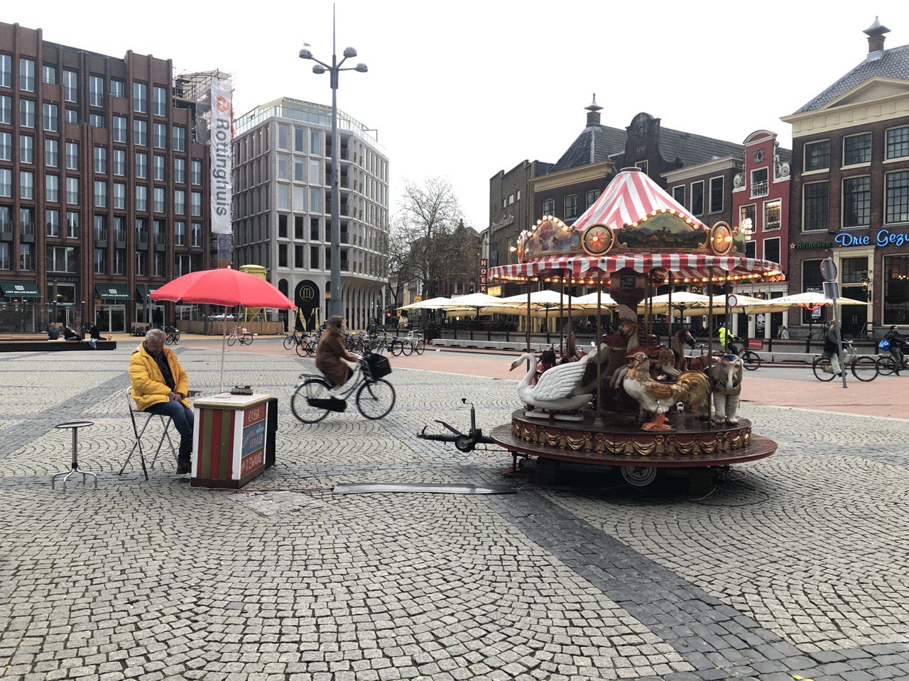 Het is een bijzondere aanblik. Daar waar normaal gesproken een booster, spookhuis en achtbaan worden opgebouwd, staat nu een eenzame draaimolen op de Grote Markt. Of zoals eigenaar Jan van der Zwaag zijn machine liever noemt: ‘een nostalgisch carrousel’.