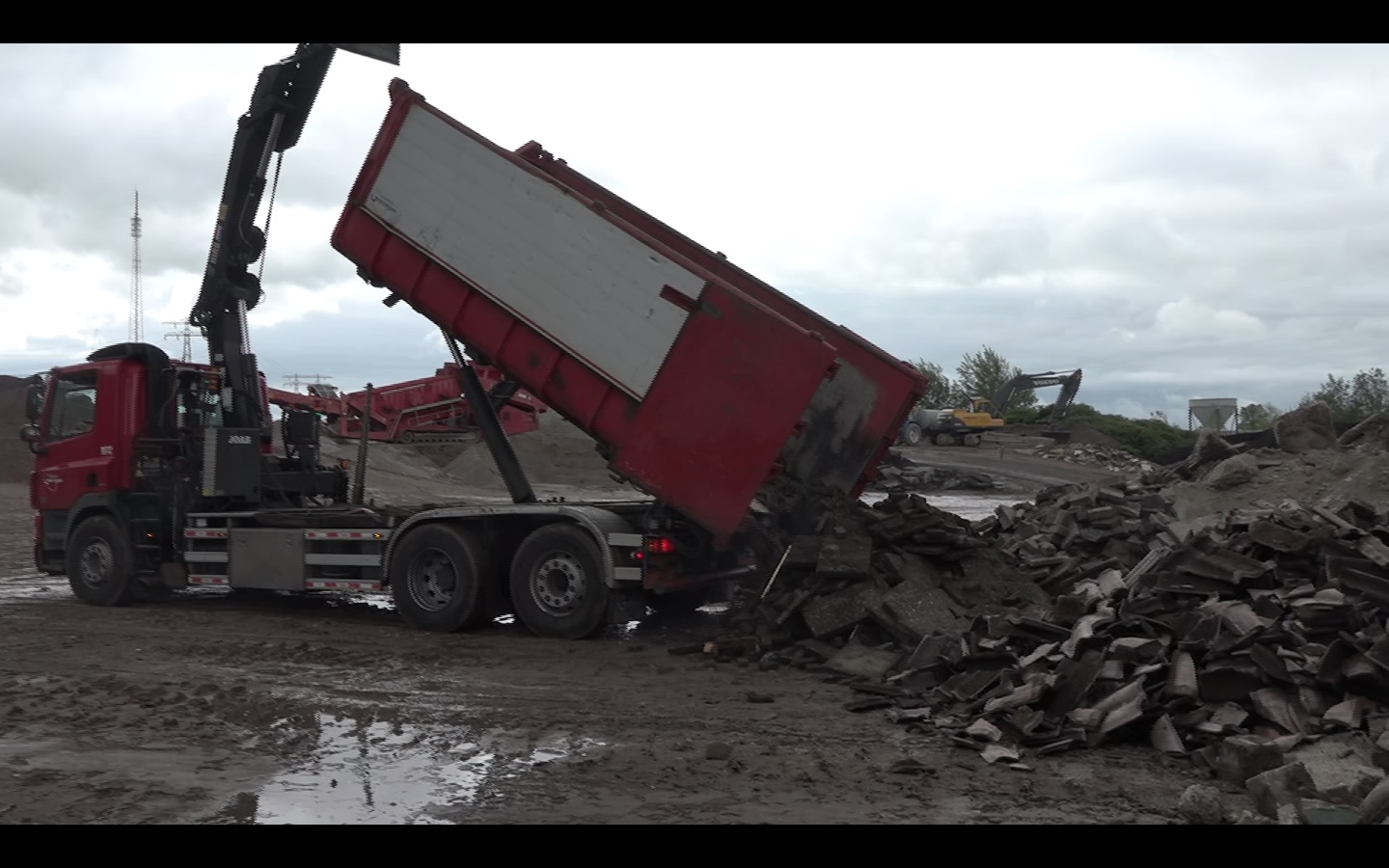 Na tweeënhalf uur zit Kuipers’ wagen aan de maximale belading. Met 7000 kilo in de laadbak rijdt hij richting een recyclebedrijf in Groningen. Daar lost hij, naast een metershoge bult afval. ‘Het zijn voornamelijk grindtegels, stoepranden, gewone tegels, klinkers, dikformaten en gewoon beton,’ analyseert Kuiper zijn zojuist geloste stapel.