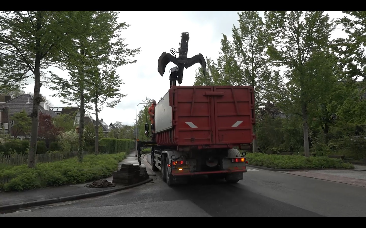 Dit voorjaar rijdt er een nieuw type taxi door de gemeente Groningen: de tegeltaxi. Een grote vrachtwagen met grijper komt gratis je tuintegels ophalen. Dinsdag reed de taxi door Haren.