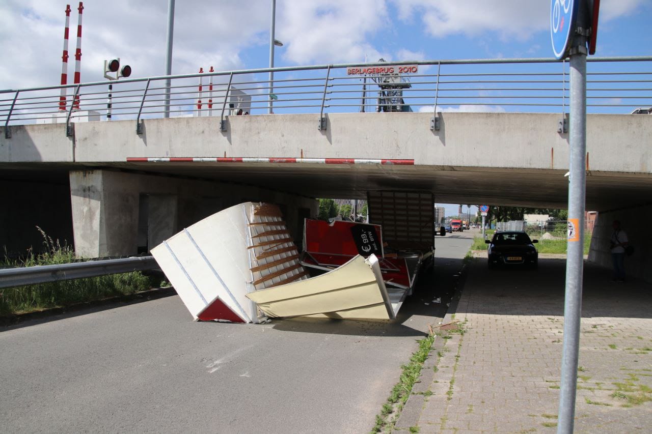 Een bestuurder reed dinsdagochtend zijn gehuurde bestelbus aan stukken bij de onderdoorgang van de Berlagebrug op het Eemskanaal-Noordzijde in Groningen.