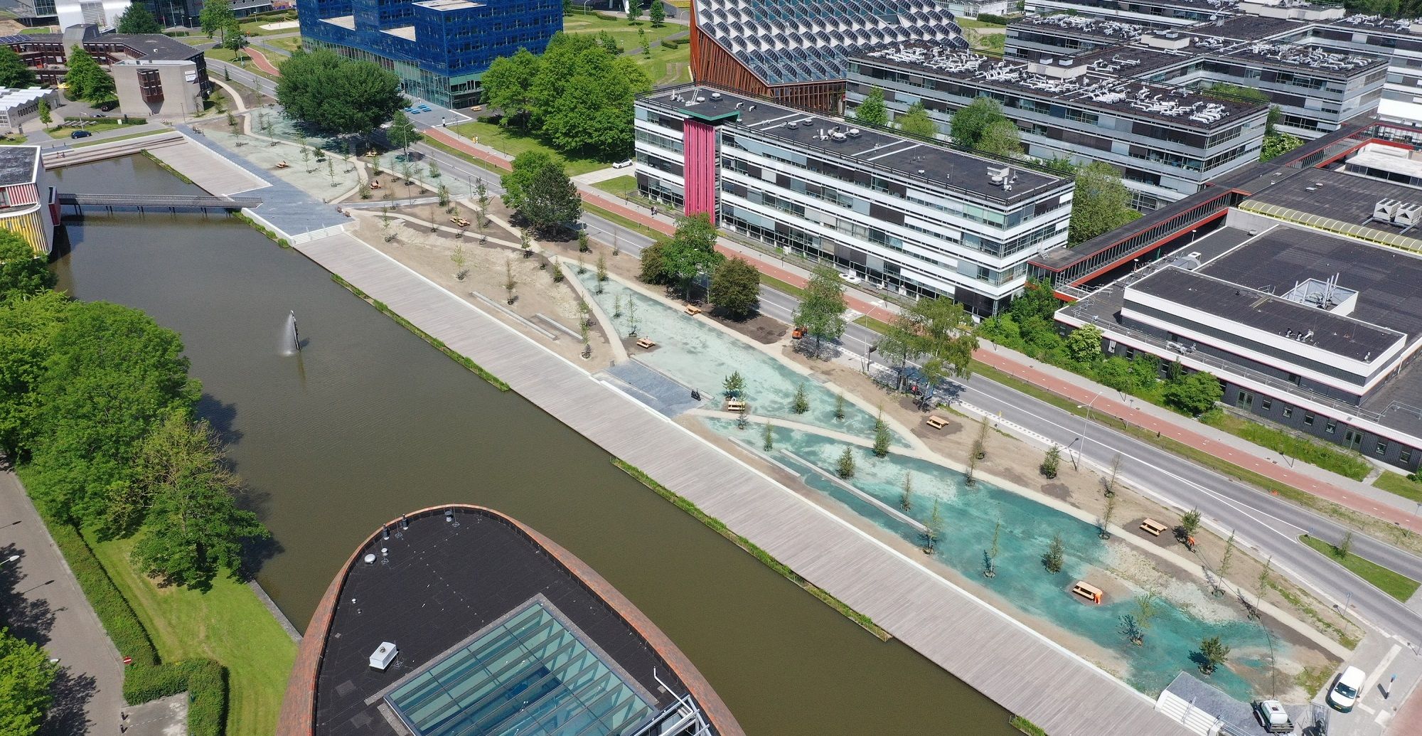 De ‘upgrade’ voor dit gedeelte van de Zernikelaan begon twee jaar geleden. Eigenlijk zouden de werkzaamheden pas aan het eind van dit jaar klaar zijn. Maar door de coronacrisis en de daling van het aantal studenten en werknemers op de campus, is het nieuwe park rond de vijver nu al zo goed als klaar.