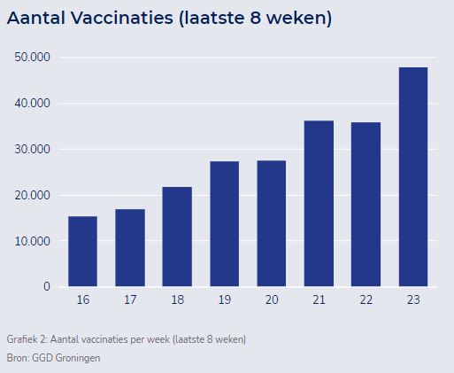 In de provincie Groningen zijn in de afgelopen week 47.982 personen gevaccineerd. Sinds er in januari begonnen werd met vaccineren zijn er in Groningen tot nu toe 319.624 prikken gezet. Dit zijn zowel eerste als tweede prikken. “Van de Groningers heeft 40% een eerste prik gekregen en 21% is volledig gevaccineerd. Elke dag worden nieuwe geboortejaren uitgenodigd en de verwachting is dat iedereen boven de 18 jaar eind van deze week is uitgenodigd. Met een gemiddelde wachttijd van twee weken kan elke Groninger boven de 18 die dit wil voor half juli een eerste vaccinatie krijgen.”