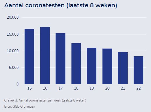 In de afgelopen week werden er in de provincie Groningen 8.455 personen getest op corona. Van hen kregen er 368 een positief testresultaat. Dit is ongeveer 4,4 procent. Het aantal afgenomen testen is in de afgelopen week gedaald. In de week voorafgaand werden er nog 9.715 testen afgenomen. Ook landelijk is er de afgelopen weken een daling van het aantal afgenomen testen.