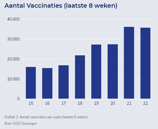 In de afgelopen week zijn er door de GGD 35.865 vaccinaties gezet. “Dit aantal is lager vanwege het wegvallen van het Janssen-vaccin uit de vaccinatiecampagne. Bijna 35 % van de Groningers heeft een eerste prik van een GGD gekregen en bijna 18% is volledig gevaccineerd door een GGD. De opkomst voor tenminste één corona-vaccinatie bij 65-plussers is in alle gemeenten in de provincie Groningen boven de 85%. In totaal zijn er in Groningen 271.641 prikken gezet. Dit zijn zowel eerste als tweede prikken.