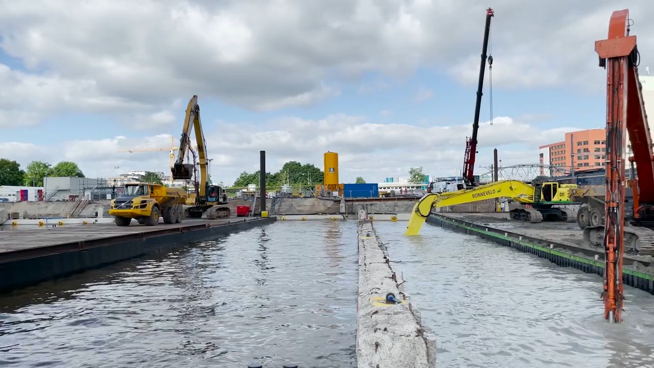 De afgelopen weken heeft Strukton water uit het Noord-Willemskanaal in de bouwkuip gepompt. Drijvende pontons ondersteunen graafmachines, die zand weghalen op de bodem van de bouwkuip. De waterdruk zorgt voor voldoende tegendruk op de wand, zodat die niet teveel vervormt en minder snel bezwijkt. De nieuwe tunnel komt ruim tien meter onder NAP te liggen.