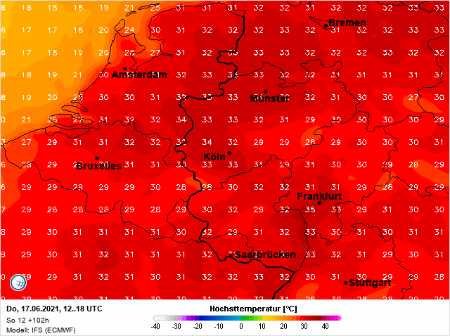 “Op donderdag gaat het hittekanon aan. Er is zelfs een redelijke kans, die ik op dit moment groter schat dan vijftig procent, dat we te maken gaan krijgen met een situatie dat een bel met extreem warme lucht vanuit Duitsland net over ons gebied weet te schuiven. De kans dat de tropische 30 graden bereikt gaat worden is zeer groot, maar mogelijk wordt het zelfs nog een stuk warmer met 32 tot 34 graden. Ik beschouw het op dit moment als een niet ondenkbaar scenario. Op donderdag zal het drukkend en broeierig aanvoelen. Van de zwakke zuidenwind hoeven we geen verkoeling te verwachten. In de avond en nacht wordt de kans op een onweersbui groter en volgt een echte plaknacht waarbij de minimumtemperatuur rond de 20 graden komt te liggen.”